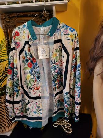 Ladies Blouse with gorgeous floral pattern for sale. New, with tags. Tag says size XL. (Other items in the ad are also for sale separately: Long purple wig- $50 Floral yellow mini hat- $30)