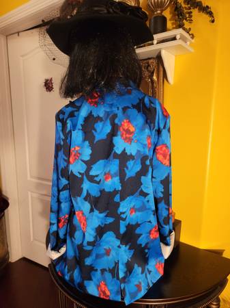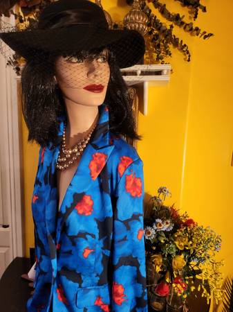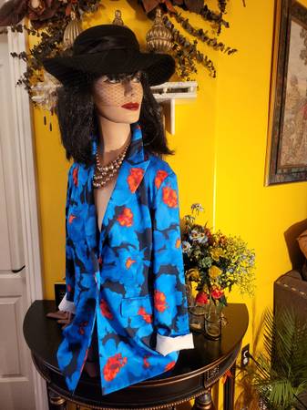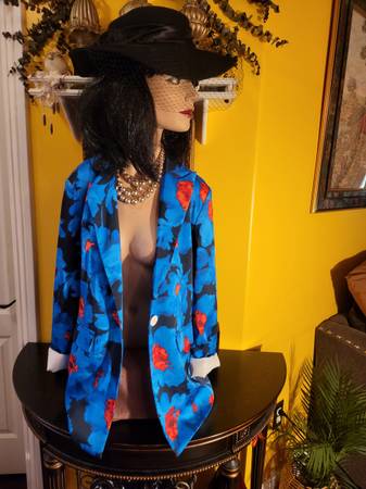 Stylish Ladies Jacket for sale. Bright blue colors with floral patterns , button closure in the front. Size M. (Vintage Mannequin Bust is also for sale $80. She has some scrapes).
