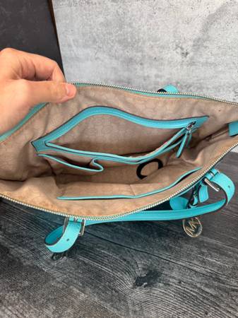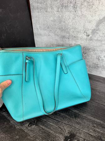 You’ll love the color of this bag! Leather Micheal kors turquoise bag. Very functional, lots of pockets and compartments