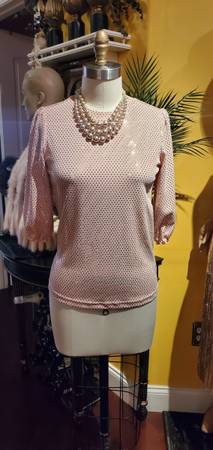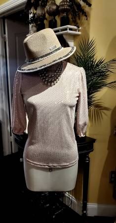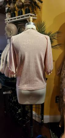 Beautiful light blush color party top (blouse) from brand Nanette Lepore. Features rose gold sequin details throughout. Sparkling sequins add a glam factor to this chic top.