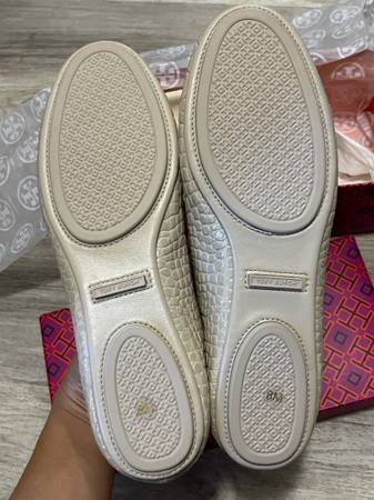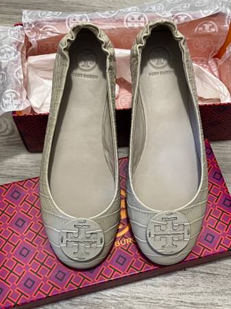 NEW Tory Burch Minnie Travel Ballet Flats Size 8 Silvery Pearly Light Gray. Box and dust bag included. Unworn/unused. No wear, tear, scuff, scratch or stains. Decluttering sale for $145 OBO....