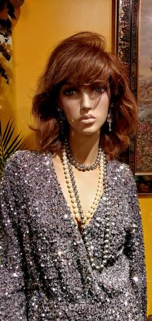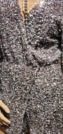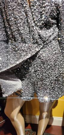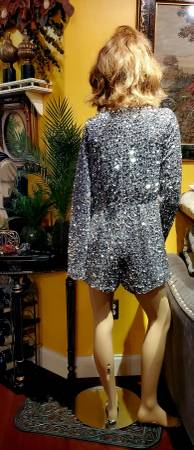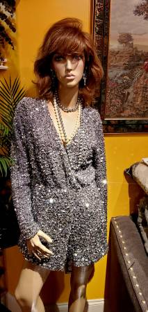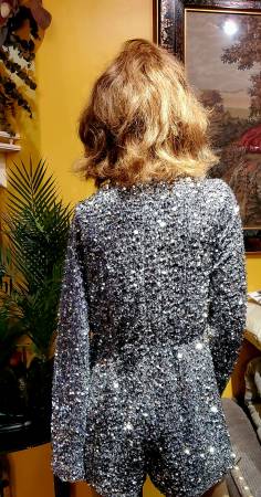 Sparkling all over sequin romper (jumpsuit). Low cut, skirt flap over shorts , zipper closure in the back. Size L. Slightly used. (Faux pearls necklace-$40)