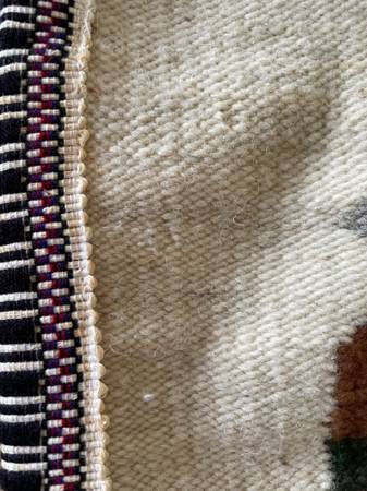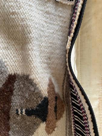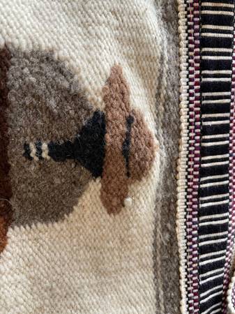 South American never-used woven bag, approximately 15" by 17". The bag has a perfect shade on the outside and slight age discoloration on the inside lining.