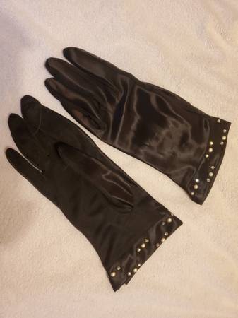 These gorgeous vintage gloves belonged to my grandmother and are in perfect condition. Black satin & mesh with rhinestones & faux pearls. No tag but my guess on size is small or medium....