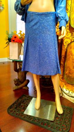 Top has front buttons closure, pleated skirt has zipper in the back.