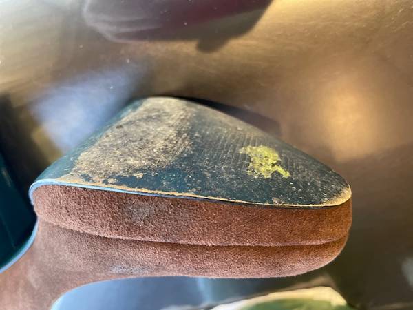 Steven by Steve Madden brown suede pumps with teal heels, size 6 1/2, 4" heel, one side of one heel has deep scuff marks, otherwise good condition