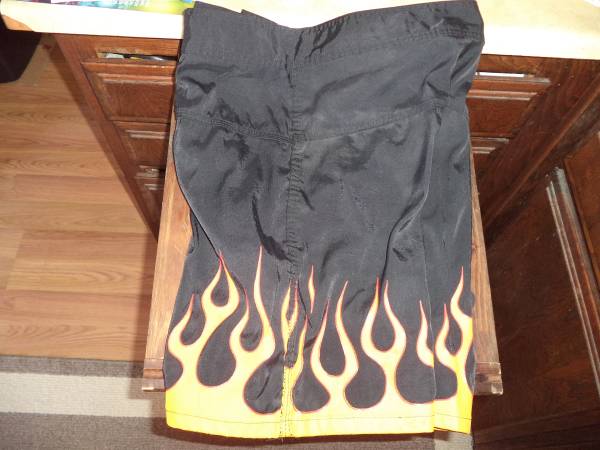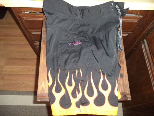 The original Vintage Von Dutch flamed board/surf shorts for men. Waist size is approximately 36". Very nice, thick material, triple stitched. There are female images in the flames, sweet! There were only a few made and I bought these from the Von Dutch store that use to be in Huntington Beach, Calif. Tie rope with Velcro front. The price was considered because of the rarity and the quality of these shorts plus these make a statement. Local pickup is welcomed, cash only NO checks of any kind. Shipping is extra. Make me an offer, if I don't reply you have your answer. New location-City of Vista in San Diego County-AS LONG AS YOUR READING THIS AD, YES, IT'S STILL FOR SALE.