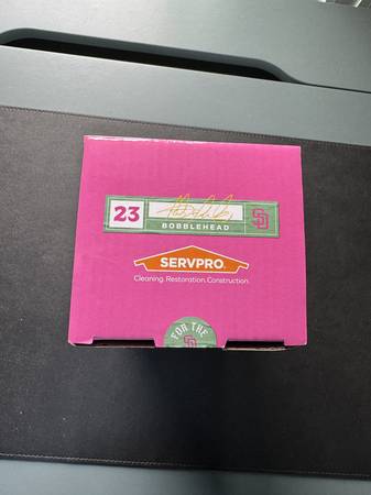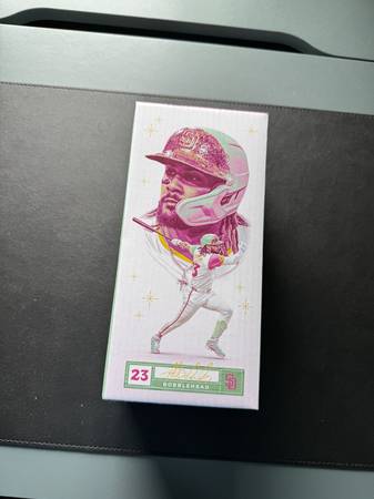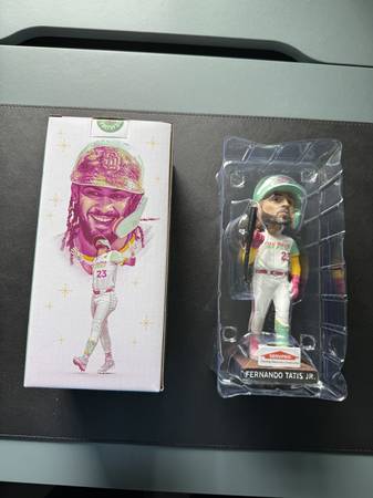 Our roommate is selling this Fernando Tatis Jr. bobblehead. Got it from her dad as a gift and never used it. Basically brand spanking new. She is moving out of state to AZ and needs every dollar she can get, so it is all yours. It has Tatis with a rotating bat, simulating a bat flip. This bobblehead was given away to the first 40,000 fans at Petco Park on June 23, 2025, during the game against the Nationals. Roughly 7 1/2 inches tall and 2 3/4 inches wide.Coming from a pet free and smoke free home! You can come pick it up this week! Sorry, my camera skills are not the best.