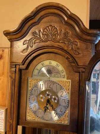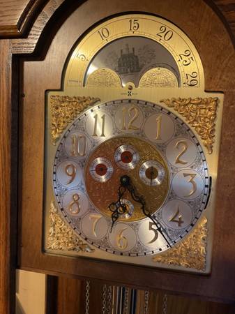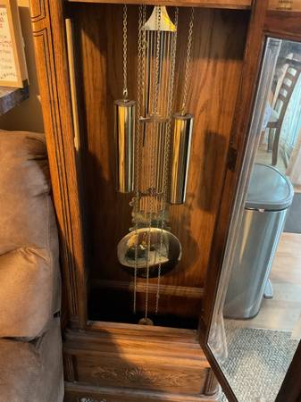 74 inches tall amazing looking clock the mechanism works perfectly “Howard Miller” is the brand I paid 2K years back I’m willing to take 250 in great condition the chimes sound cathedral style.