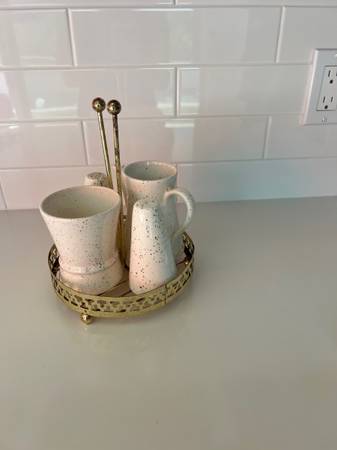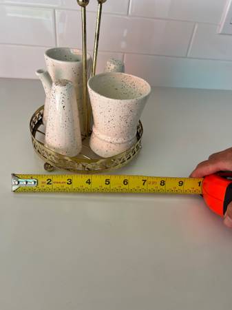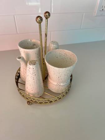 This is a speckled vintage creamer sugar set with salt and pepper shaker