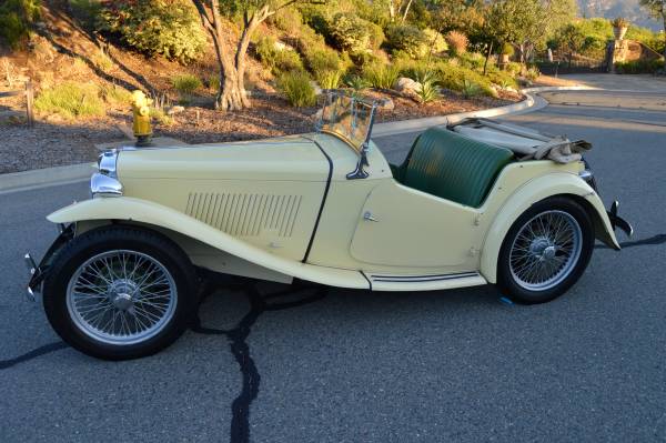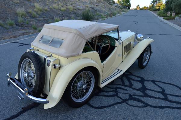 1949 MG TC. This MG has just come out of long term ownership. An extra addition to this TC is that it is an EXU vehicle and they only made 494. Comes with a 1250cc engine with a four speed manual transmission The drivetrain is matching numbers. This vehicle runs and drives. Original SU carburetors and air cleaner assembly. Drum brakes on the front and rear. Manual steering and manual brakes. Painted 19" wire wheels with Bias ply tires. Still retains its factory spare.