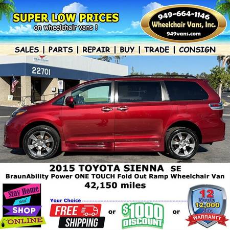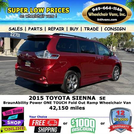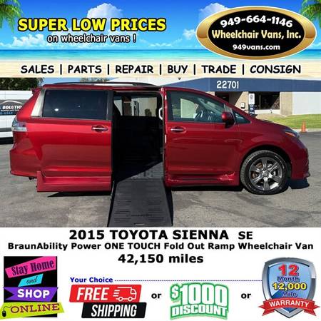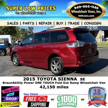 2015 Toyota Sienna SE Wheelchair Van Minivan Exterior Color: Salsa Red Pearl Interior Color: Black Engine: 3.5L V6 266hp 245ft. lbs. Fuel: Gasoline Transmission: Automatic Drivetrain: Front Wheel...