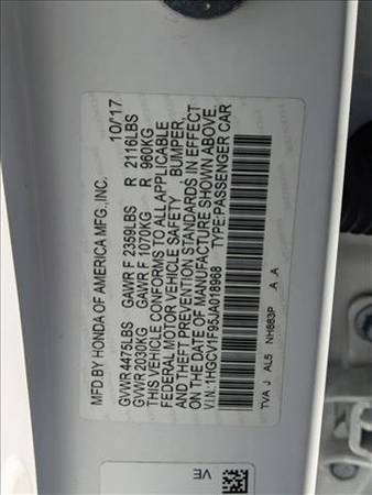The following items have been reconditioned on this vehicle: new pair of tires! * Moonroof * Leather Seats * Navigation System * Lane Keeping Assist * Keyless Start * Heads-Up Display * Cooled Front Seat(S) * Platinum White PearlThis vehicle includes a Money-Back Guarantee* and passed our precise inspection process. Best of all the price you see is the price you pay. No haggling. No back and forth. No pressure. And this price is so good it is guaranteed.BMW of Carlsbad is pleased to be currently offering this 2018 Honda Accord Sedan Touring 1.5T with 84,335mi. This Honda includes: PLATINUM WHITE PEARL *Note - For third party subscriptions or services, please contact the dealer for more information.* Low, low mileage coupled with an exacting maintenance program make this vehicle a rare find. Based on the superb condition of this vehicle, along with the options and color, this Honda Accord Sedan Touring 1.5T is sure to sell fast. The quintessential Honda -- This Honda Accord Sedan Touring 1.5T speaks volumes about its owner, about uncompromising individuality, a passion for driving and standards far above the ordinary.*Money-Back Guarantee is valid for 5 days or 250 miles, whichever comes first. Subject to certain terms and conditions. See store for details. Some restrictions apply.