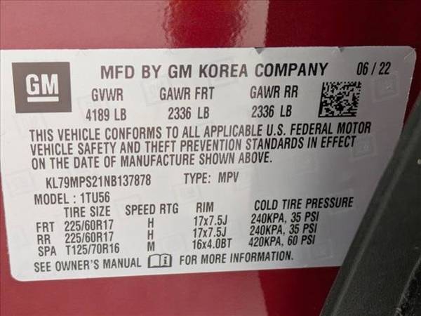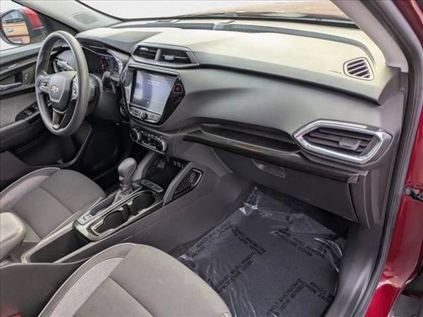 * Convenience Package * Driver Confidence Package * Lane Keeping Assist * Keyless Start * License Plate Bracket; Front * Air Conditioning; Single-Zone Automatic Climate Control * Audio System; Chevrolet Infotainment 3 System * Axle; 5.45 Final Drive Ratio * Crimson Metallic * Display; 8" Diagonal Color Touchscreen * Emissions; California State Requirements * Engine; Ecotec 1.2L I3 Turbo Dohc Di With Variable Valve Timing (Vvt) * Gvwr; 4189 Lbs. (1900 Kg) * Jet Black; Cloth Seat Trim * Lane Change Alert With Side Blind Zone Alert * Lt Preferred Equipment Group * Mirror; Inside Rearview Auto-Dimming * Power Outlet; 120-Volt * Rear Cross Traffic Alert * Rear Park Assist * Seats; Front Bucket * Sensor; Cabin Humidity * Tires; 225/60R17 All-Season; Blackwall * Transmission; Continuously Variable (Cvt) * Usb Charging-Only Ports * Visors; Driver And Front Passenger Illuminated Vanity Mirrors; Covered; Sliding * Wheels; 17" (43.2 Cm) High Gloss Black Machined Aluminum * Not Equipped With Driver And Front Passenger Heated Seats * Not Equipped With Rear Park AssistAutoNation Subaru Carlsbad has a wide selection of exceptional pre-owned vehicles to choose from, including this 2022 Chevrolet Trailblazer. This Chevrolet includes: ENGINE, ECOTEC 1.2L I3 TURBO DOHC DI WITH VARIABLE VALVE TIMING (VVT)3 Cylinder Engine Gasoline Fuel Turbocharged *Note - For third party subscriptions or services, please contact the dealer for more information.*This SUV is a great example of beauty and brawn with classic styling and a workhorse power plant. If you are looking for a vehicle with great styling, options and incredible fuel economy, look no further than this quality automobile.With less than 18,588mi on this Chevrolet Trailblazer, you'll appreciate the practically showroom newness of this vehicle.