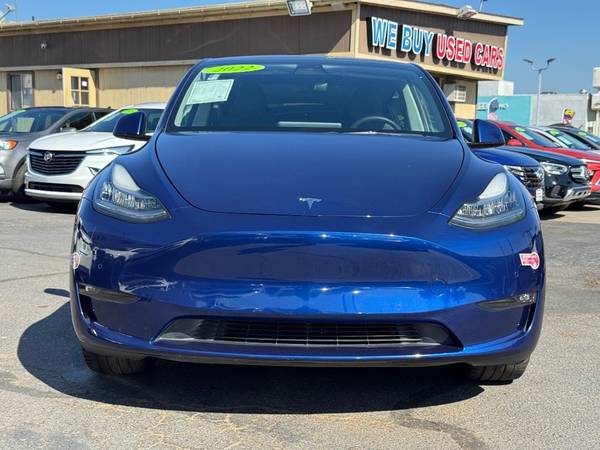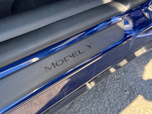 Our 2022 Tesla Model Y Long Range AWD is great for going on adventures without wasting gas in Deep Blue Metallic. Powered by Dual Electric Motors supplying a combined 384hp to a Single Speed Automatic transmission for spirited sprints to 60mph in only 4.8 seconds. This All Wheel Drive SUV can also keep on going with nearly 330miles of range and return nearly 127MPGe in the city, thanks to a 75kWh battery pack. Distinctive design helps our Model Y stand out from the crowd with a smooth, wind-cheating shape, LED lighting, fog lamps, a glass roof, heated power-folding mirrors, and premium alloy wheels.