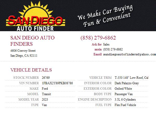 San Diego Auto Finders 4606 Convoy Street San Diego, CA 92111 Ask for: Sales main: (858) 279-6862 2023 Ford Transit T-350 148" Low Roof, Call Now 858-279-6862 Passenger Van