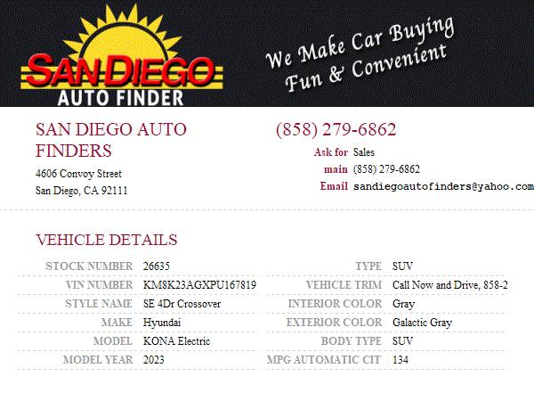 San Diego Auto Finders 4606 Convoy Street San Diego, CA 92111 Ask for: Sales main: (858) 279-6862 A27FBAFAEA464DBBB650D168074EE06C 41843864 12095653