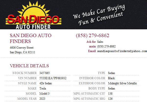 Enter this link to see more images plus all other inventory we have available: https://lyv.cc/L3NA3San Diego Auto Finders Ask for: Sales ☎ (858) 279-6862 4606 Convoy Street San Diego, CA 92111 San Diego Auto Finders 4606 Convoy Street San Diego, CA 92111 Ask for: Sales main: (858) 279-6862 2023 Tesla Model 3 Sedan