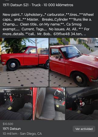 1971*Datsun. 521. Super clean..... no issues. Smog. Exempt..... Neww:::: *paint... *Webber..carburator..*tires * wheelcaps..*upholstery...*brakes cylinders...*battery... And. Lots more. Stuff.... Current tags.... clean title. On My. Name......*"*.Runs. Like. A. Champ""*!!.. Sale. It. As. Is......$$.9300. Dlls....$$$$no less cash. Only ..inf. 619five4834ten*' Mr. Bob..