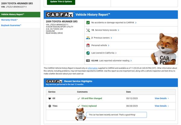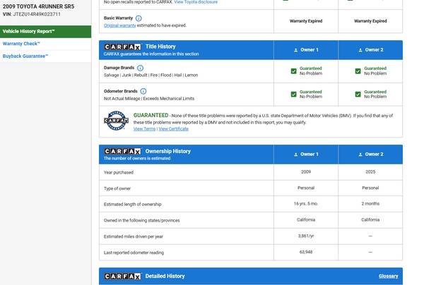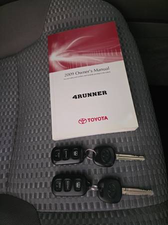 2009 4Runner SR5 in amazing condition with only 63k miles. This 4Runner is as close to show-room condition that you'll ever find. Its a rare 2009, Galactic Gray Mica, that are difficult to find since Toyota shut down the factory early to re-tool for the 2010's. This is a California car and did not come in from out of state (per Carfax).It has a sun roof, but isn't a 4x4 or have a V-8. Never been in an accident, new tires (less than 100 miles), engine sounds 'perfect'...it will put you to sleep it's so quiet! :) Comes with two sets of 'new' OEM interior floor mats (one rubber, one carpeted) and two OEM cargo mats. The original set of keys and owners manual are included. I have clear title to the car with no liens on it. One recently sold identical to this one on Bring Your Trailer for over $25k that had over 80k mileage but had the 4x4 drive train. I was looking for a car for my 15 yo daughter that soon will be getting her drivers license, but this car is much too nice for a first time teenager to drive, so I'm selling it. I've only owned it for two months and driven it approx. 100 miles since I purchased it. This car belongs in the Toyota museum.:)