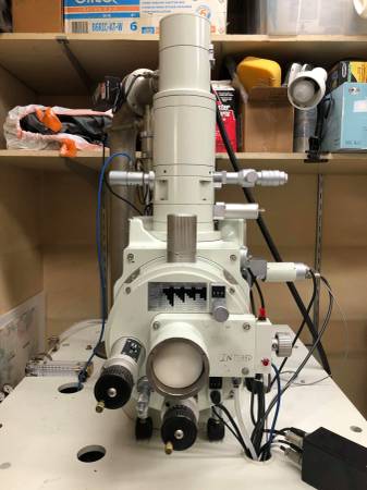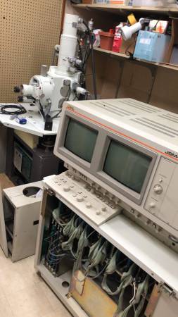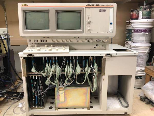 We have a JEOL 6400 JSM with complete schematics, service manual, user manual, roughing pump, nitrogen cylinder, regulator, and water chiller. We are looking to sell the unit as is and all together. The electron microscope can turn on and produce an analog micrograph. The digital display CRT is no longer functional, but an auxiliary TV screen can be used instead. The image resolution is quite low as the microscope requires a good cleaning and alignment. It uses a tungsten filament and has two oil diffusion pumps. Pick up would require a truck with a lift gate and a pallet jack. Enterprise allows liftgate truck rental and home Depot rents pallet jacks.