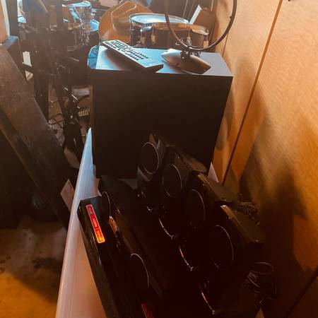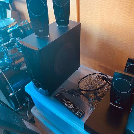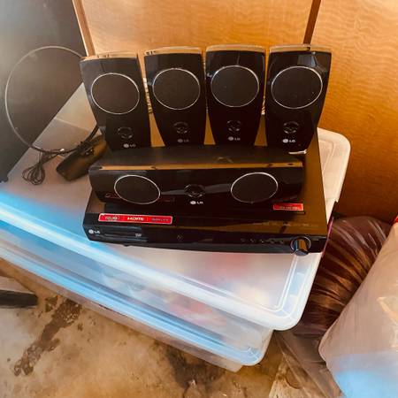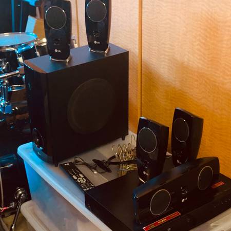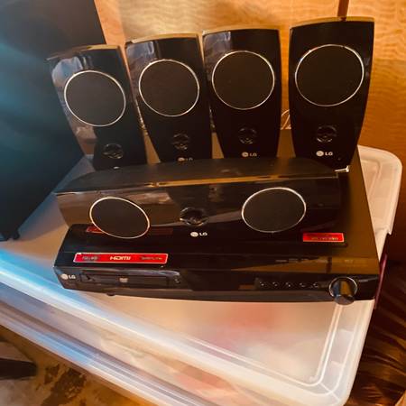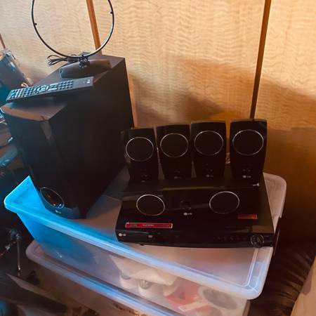 LG Surround Theatre Sound Speaker System With DVD Player and 5 speakers And a Subwoofer Speaker , remote control and an antenna, and all the wiring to hook it up.