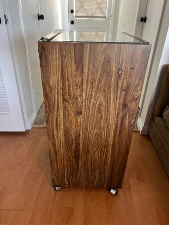 4 Shelf Stereo wood cabinet glass top on rollers.