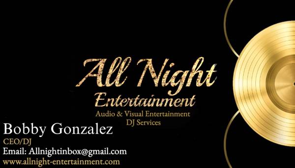 Here at All Night Entertainment we specialize in upscale black tie events. Weddings, Sweet 16’s, Quinceañeras, Proms, You name it. We DJ all events & offer a professional service tailored to each event. We use state of the art DJ equipment that meets industry standards for top quality sound and production. We have the pleasure of bringing life to every event. When you book All Night Entertainment you are booking professionals that are organized, reliable, and pay attention to detail. We play all genres of music that will keep the crowd moving, dancing, and entertained. This is your event don't settle for less, make it a night to remember.