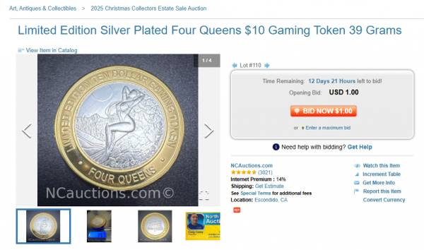 Limited Edition Silver Plated $10 Four Queens Gaming Token 39 Grams