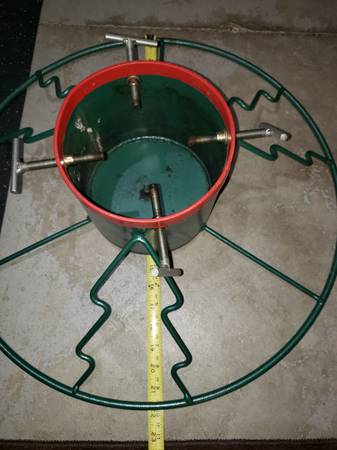 Beautiful & very strong Christmas tree STAND, Southwestern style, 4 big bolts tighten around any size tree from small to very large (reservoir is 7" in diameter & 7" high) Has a strong steel peg inside that will keep you tree solid & unable to slide once you place the tree. Stand is 22" inches across. Forget the crappy stands the live tree places/farms sell you. This stand will last a lifetime. You can find this stand at Home Depot online for $58.98 + tax