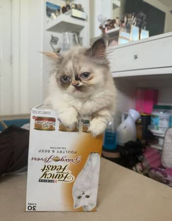 Persion kitten : 3 months and half . Potty trained, eat fry wet food All vaccines all done ! Can give you her vaccines paper
