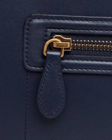 This structured designer handbag is finished with two side pouch pockets, goldtone hardware and double rolled handles.