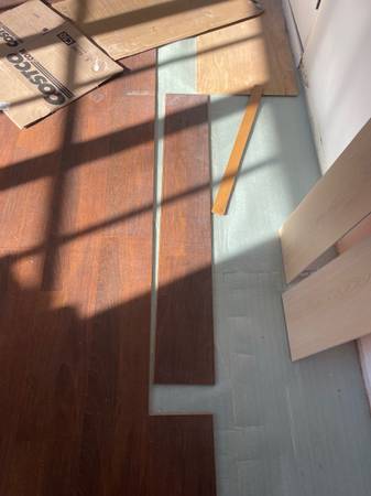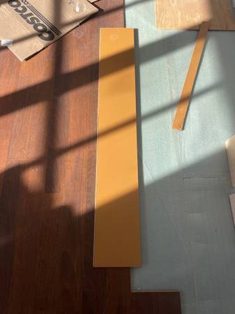 Vinyl tongue & grooved plank flooring Color: faux wood grain Amount: enough to cover 200 square feet Dimensions: 51” x 7.75”