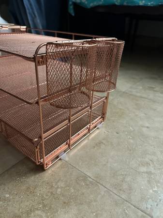 4 spacious trays, a vertical file organizer, 2 convenient hanging pen holders, and a sliding drawer Material: Metal
