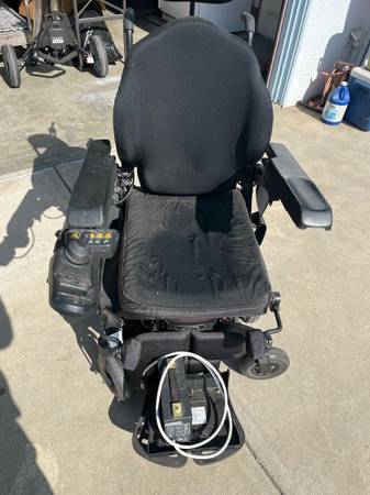 Pulse 6 electric wheelchair. Only used about four times. Has rack for oxygen bottle and other attachments. Been sitting a long time. May need new battery.
