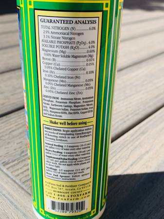 Start with Grow Big for abundant green growth. Switch to Tiger Bloom at the first sign of bud set or flowering. Use Big Bloom throughout all growing cycles to heal root systems and increase nutrient cycling. Ideal for mature, late-season flowers and fruit. FoxFarm Big Bloom 0.01-0.3-0.7 This microbial active, water soluble instant plant food specifically formulated to promote and emphasize the blooming characteristics of all flowering and fruiting plants. Big Bloom promotes extra large, multiple blooms while dramatically enhancing the flavor of fruits and vegetables. High PK content sweetens taste, fragrance and oil production. It is suitable for hydroponics, soil, and drip irrigation systems. Can be used for the whole cycle of plant and in conjunction with other FoxFarm nutrients. FoxFarm Grow Big 6-4-4 Get your garden going with Grow Big, our fast-acting, water-soluble fertilizer for lush, vegetative, compact growth. Use Grow Big early in the season when young plants need an extra boost. We add earthworm castings and Norwegian kelp into this special brew to encourage sturdier, healthier stems and leaves, but we also provide enough nutrients and trace minerals to create the kind of healthy branching that you'll need later in the season for more abundant buds and blooms. FoxFarm Tiger Bloom 2-8-4 Tiger Bloom is a low salt, 80% organic fertilizer with chelated minerals. To facilitate easy and immediate absorption this formula is biologically active. It creates a huge flower canopy, massive bud set, prolongs the flowering stage. Tiger Bloom contains just the right amount of Nitrogen to ensure sturdy lush greenery, growth and vigor as well as producing intense color and blossoming, and dark, dense cell tissue. Perfect to use on any plant at the time of flowering.