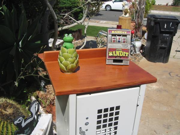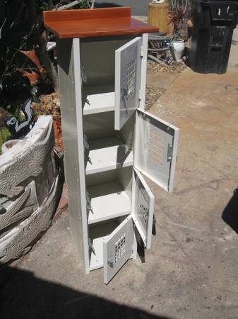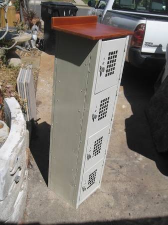 Repurposed metal locker with four doors. Top was custom made out of solid wood to act as a dresser top. This would be great for a kids room, shoe storage. Perfect for a smaller space with plenty of storage. Measures 51'' tall and lockers are 12'' wide x 12'' deep. The solid wood top is 16'' wide x 12'' deep. ---if interested leave a call back number for quicker response---