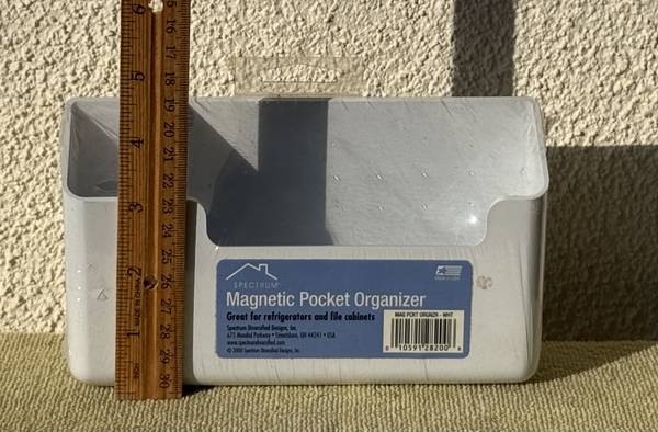 New-in original packaging. Good quality. Large magnet on the back. Holds a lot of "stuff". 4 3/4"H x 7"L. Made in USA. Does not include contents of photo #1. Great on file cabinets, refrigerators and/or tool cabinets.