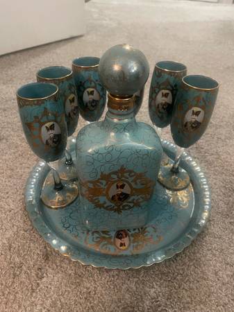 Six wine glasses , tray & bottle New , with Persian king symbol