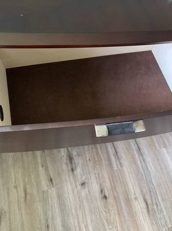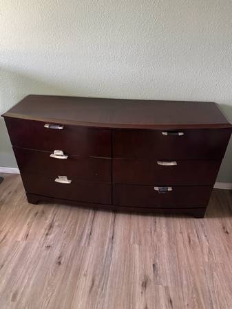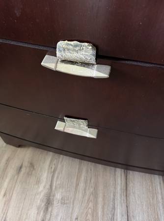 The condition is used. The two issues are 1) the leather handles have lost their glue and are peeling off, and 2) some of the drawers will need replacement tracks/hooks that have worn down. See pictures. Perfect for someone who doesn’t mind that (you can make it work) or someone who wants a project to fix it up. Our roommate is selling this Wooden dresser. Very solid, wooden dresser with 6 drawers. She is moving out of state to AZ, can't bring it with her, and needs every dollar she can get, so it is all yours. The dresser is roughly 15 ft 2 inches long x 19 1/2 inches in depth x 35 inches tall. The 6 drawers are roughly 26 inches wide x 14 1/2 inches in depth x 7 inches tall. When empty not too heavy at all. Coming from a pet free and smoke free home! You can come pick it up this week! Sorry, my camera skills are not the best.