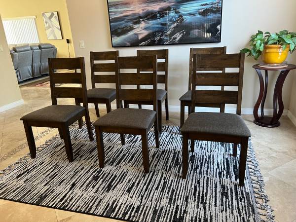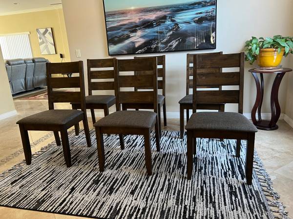 6 Beautiful Brand New Solid Wood Ladder Back Chairs with Neutral Maintenance Free Fabric Seats ( 20”W x 22.75”D x 38”H ) Im selling all 6 for $475 firm or $85 each in sets of 2 These chairs sell for...