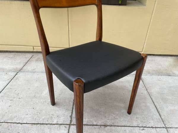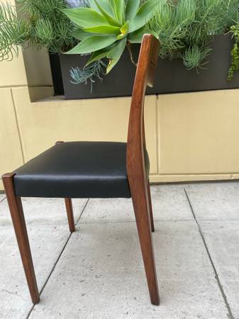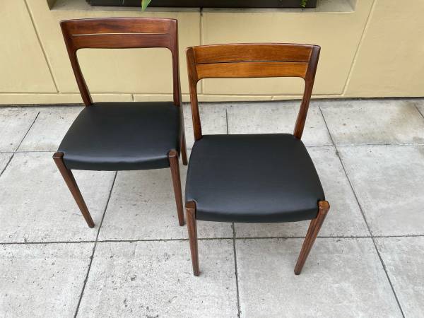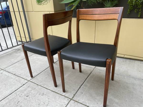 PAIR is $450. Mid Century Swedish set of two Dining Chairs made from rosewood with newly upholstered seats in black vinyl. In very good restored condition. The dimensions are: 18” Wide x 17” D x 30”...