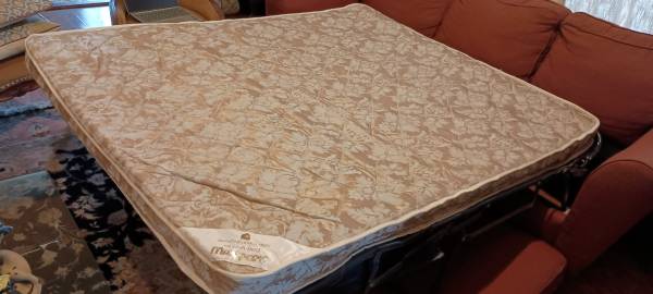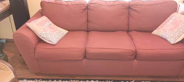Maroon Sofa Sleeper with mattress. Convert into a guest bed. Comfortably seats 3. In daily use, clean & completely functional