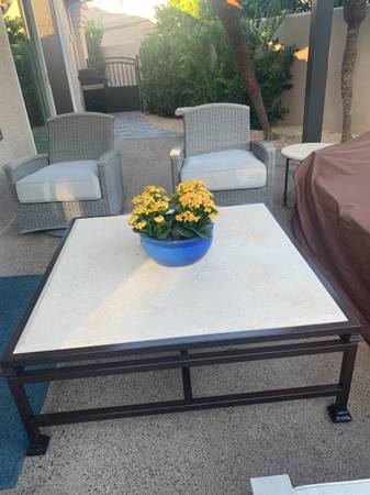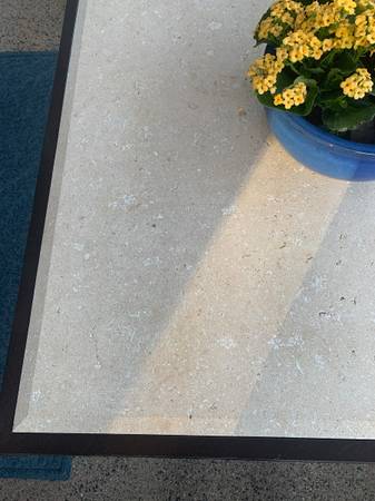 Made for outdoor/indoor use, table is in "like new condition", made of iron in BRONZE satin finish with a beveled limestone top that has been weatherproofed. Top comes out to move.Very heavy item. measures 4' x 4' x 19". This has been under a patio cover since owned.