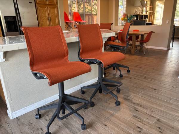 For sale are (7) Herman Miller Setu drafting chairs in upgraded soft burnt orange fabric. The chairs are all like new and were about 1800.00 each otd. Only 345.00 each with free same or next day...