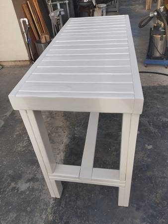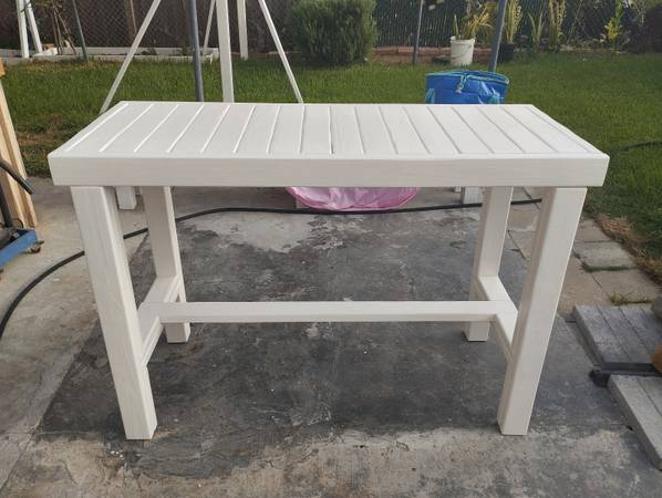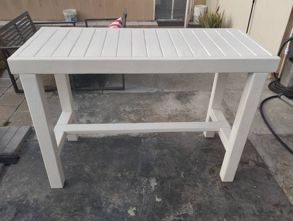 Perfect table in white. Has great 40” height perfect for standing or sitting on bar stools. Great for buffets, drinks, parties, bars, restaurants, cafes. Has a center foot rest to relax your legs. Sealed for outdoor and indoor use. Can take a rain shower or spilled drinks with ease. Delivery available.