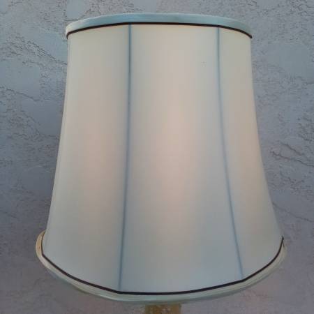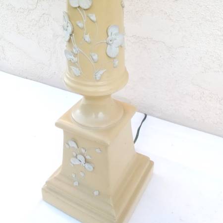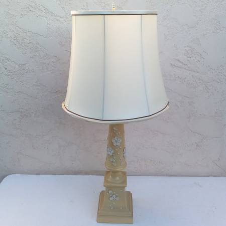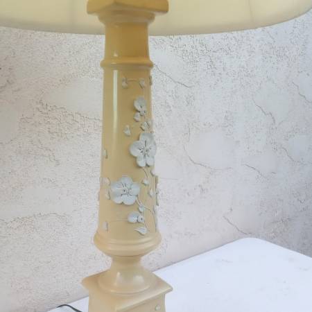 This classic table lamp is perfect for your console or sofa table, night stand, end or side table. The lamp is very pretty and warm to match your home or office decor. The base and body have a pretty floral design. The soft cream linen shade is attached at the top with a distinctive finial. A rotary switch turns the LED light bulb (included) on or off which can be switched to other kinds including a 3-way light bulb. Clean and in very good condition. $75