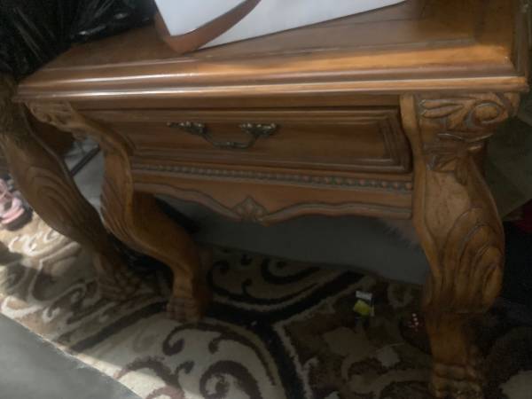 Bedroom/living room, solid, wood set, quality, 9 no dresser/3 fold mirror, headboard/footboard/rails, three drawer dresser, end tables, help deliver, can separate. Please call .