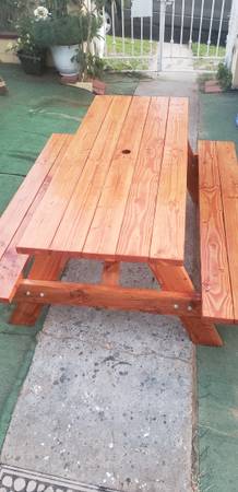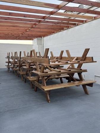 Handcrafted wood picnic tables made to order different sizes and prices and colors depending on material Douglas firewood
