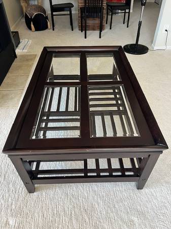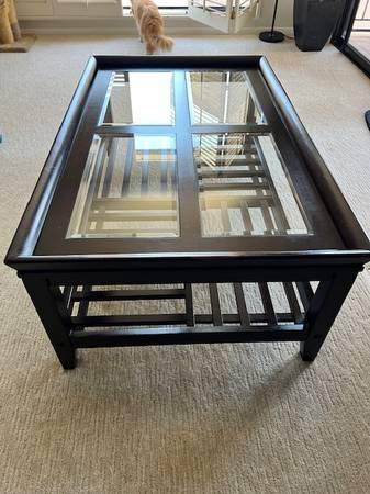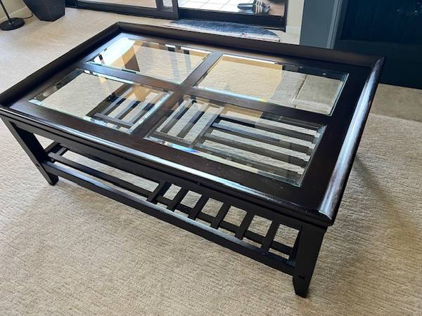 Transitional/contemporary wood coffee table (espresso color) with four glass inserts. The glass inserts are removable for easy cleaning. Free local delivery available.